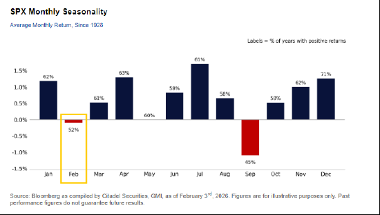 季节性因素也是美国股市面临的另一项挑战。城堡证券数据显示,自1928年以来,2月通常是全年第二弱的月份,标普500指数平均下跌9个基点。