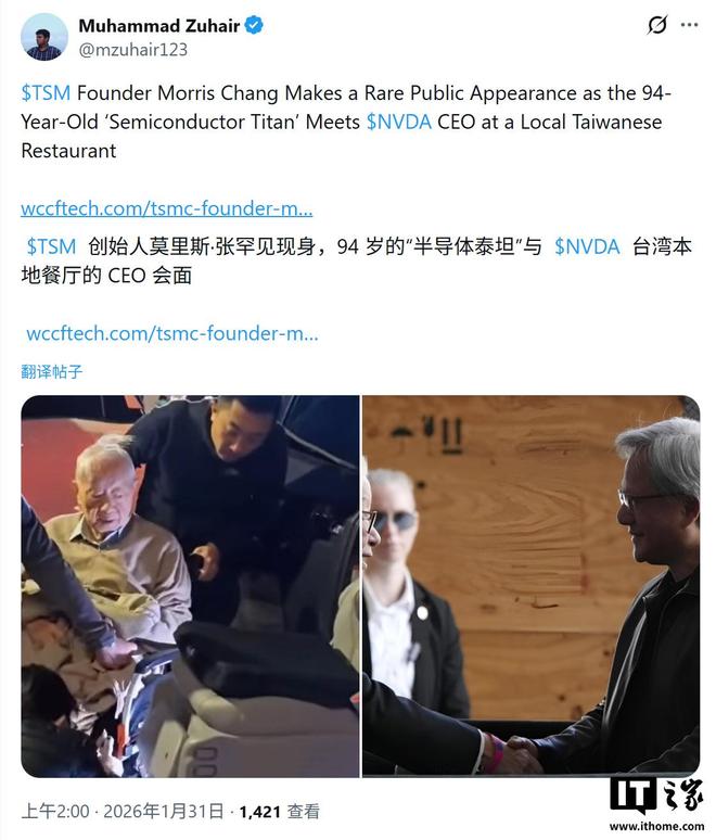 IT之家1月31日消息,科技媒体Wccftech昨日(1月30日)发布博文,报道称英伟达 CEO 黄仁勋在台北某餐厅,与94岁高龄的台积电创始人张忠谋会面。